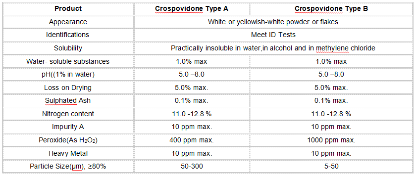 Product Properties: Crospovidone is hygroscopic,insoluble in water and all other common solvents,but it swells rapidly in aqueous solutbition without any gel froms.Its; classified as Crospovidone Type A and Type B according to the different particle size.